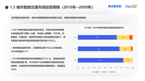 2 016 年之后,凭借地图流量、大数据、云计算、 AI、5G 等技术优势,百度、阿里、华为在智能交通领域先后崭露头角,开始冲击以传统系统集成商为主的 BIG5 的市场 话语权 。2 020 年,我国城市智能交通市场增长率再次突破 10%,交通管理占 据市场 70%以上份额,增速约11% ,车路协同市场增长更为迅猛 , 与2 019 年相比, 市场规模 实现翻倍增长,增速超 100% 。