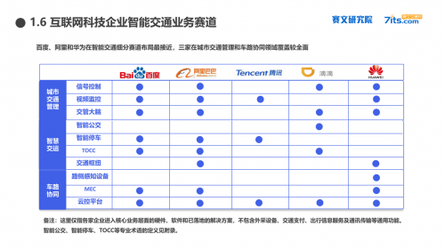 近日,赛文研究院对外发布《主要科技公司智能交通行业竞争力分析报告》。报告指出,以百度、阿里巴巴、华为、腾讯、滴滴等为代表的互联网科技企业已在深度布局智能交通行业,与传统集成商、产品商所等形成五分市场话语权的市场格局。其中, 阿里 依托云端优势,在智能交通业务和车路协同领域也有一定覆盖,华为主要依靠自研硬件产品,以产品走渠道方式来拓展行业市场。而百度凭借在自动驾驶领域的优势,系统性提出 ACE交通引擎 解决 方 案,迅速占领智能交通市场,并已在车路协同领域取得明显领先优势。